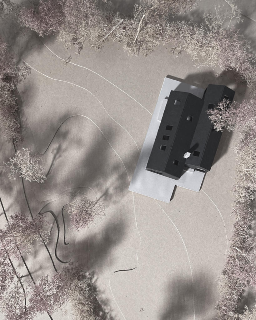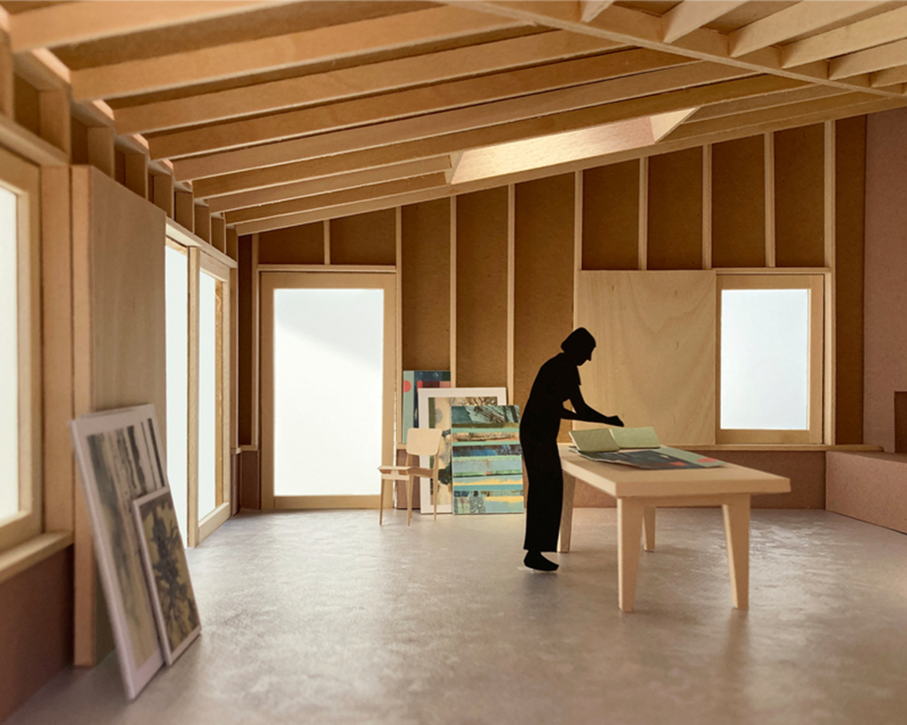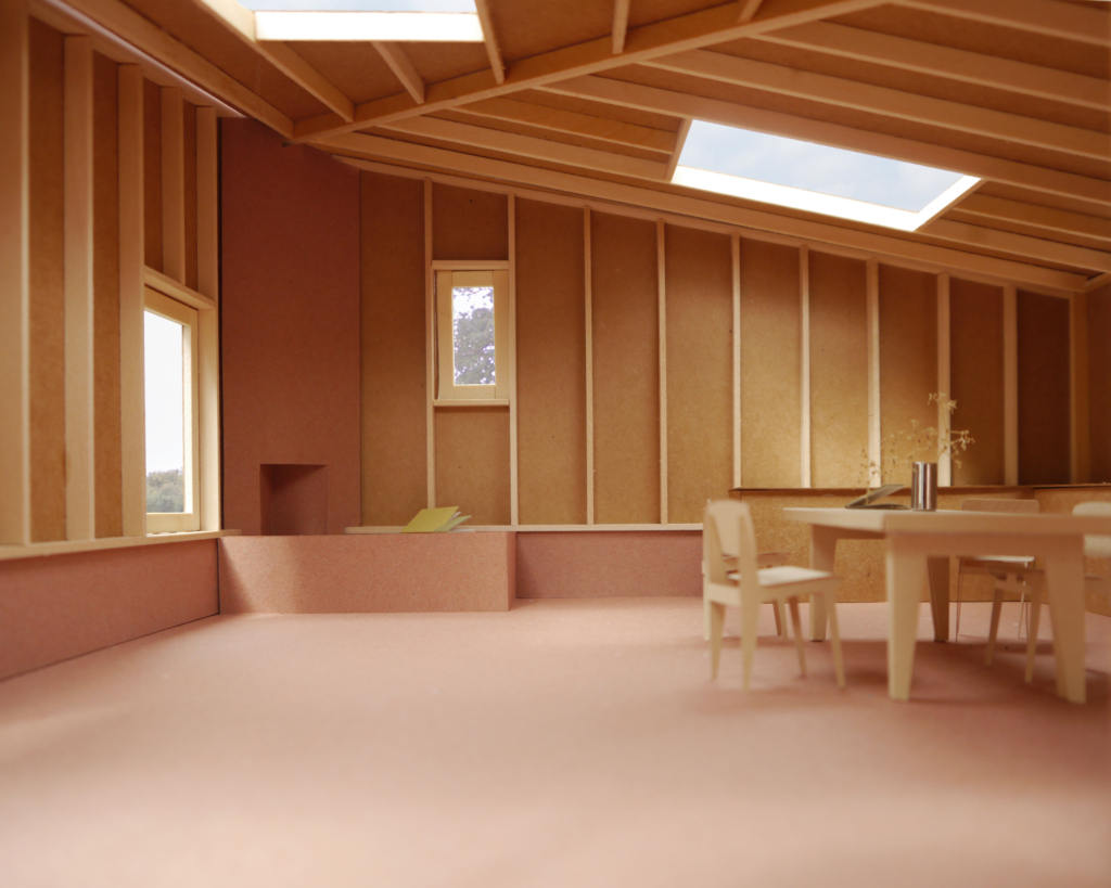 A model for an artist studio in the grounds of a former workers cottage. The studio sits as a gateway between a formal garden and the secret world of the coppice to the south.