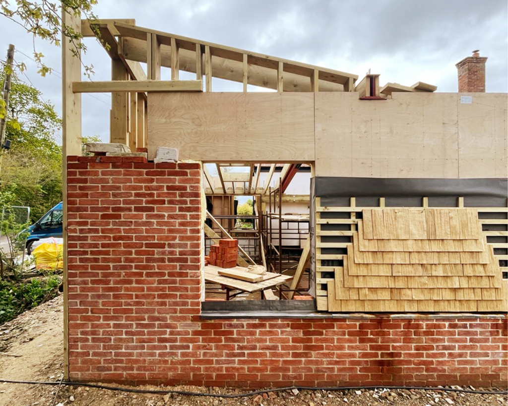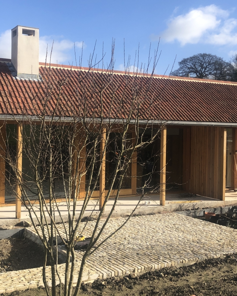 Site works are quickly progressing at our farmworkers cottage project. The bulk of the timber frame structure is up, the brickwork plinth and chimney constructed and the oak shakes are in progress.