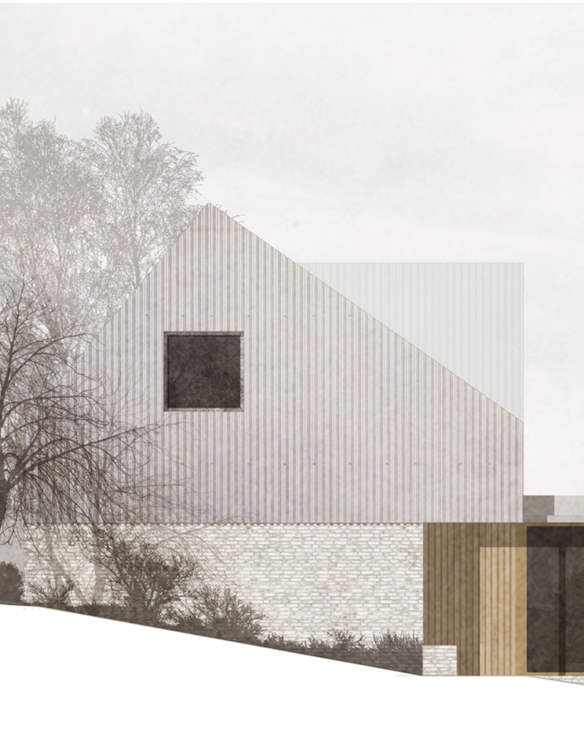 Working to transform an abandoned block of car garages into a new dwelling. The construction of the house reuses parts of the existing structure, supplemented with new elements.