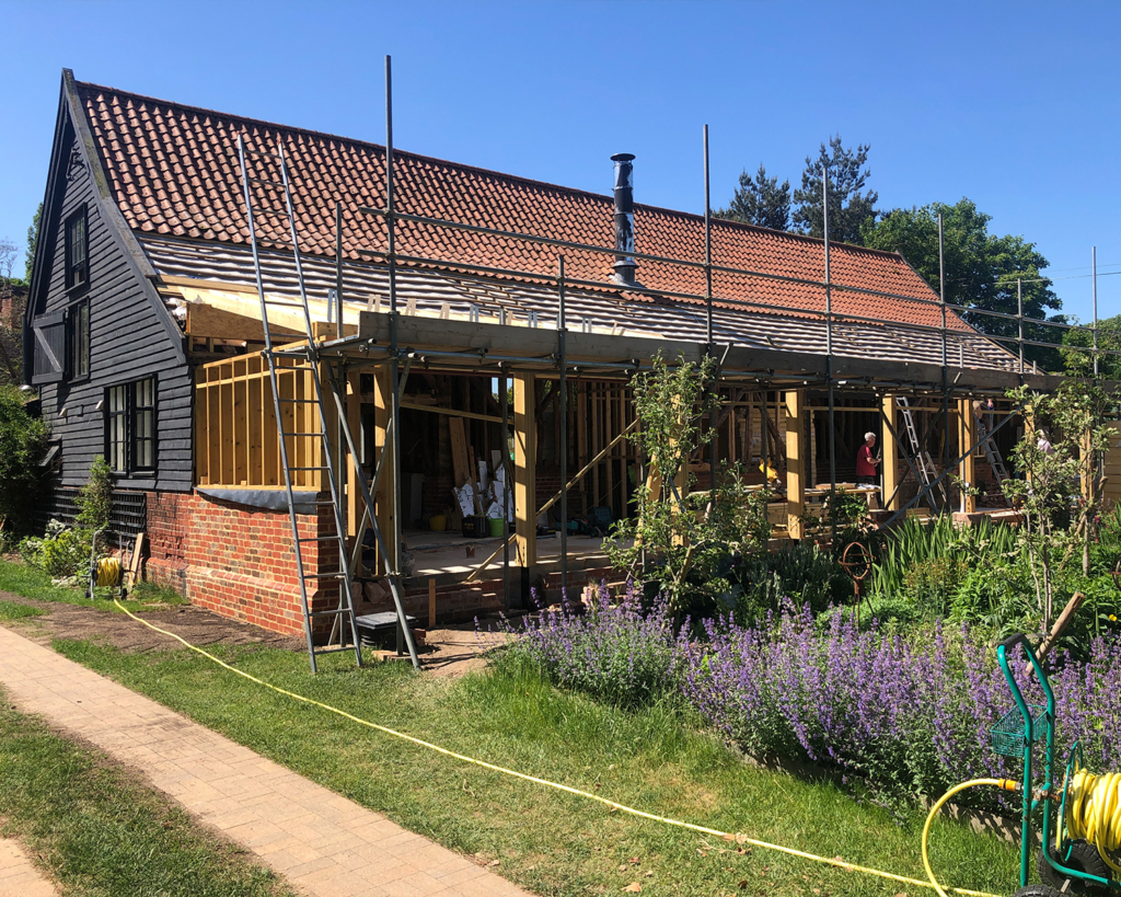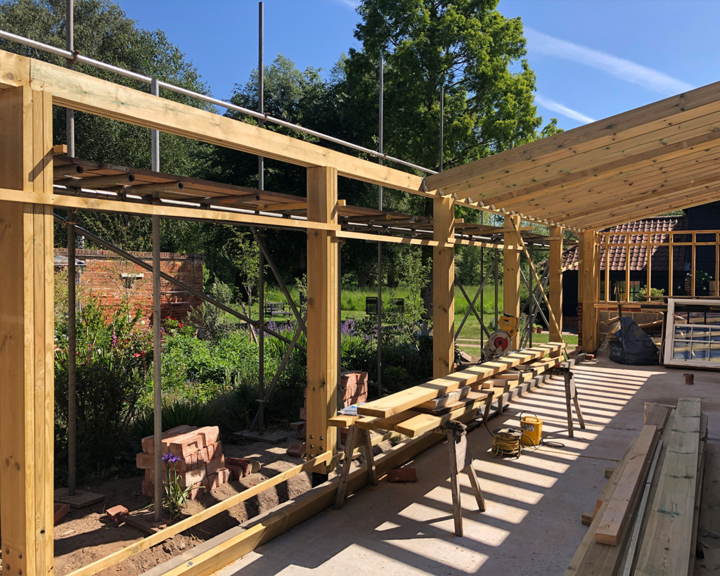 An extension was added to the northern elevation, addressing the picturesque kitchen garden, and allowing for the creation of rationalised bedroom and bathroom accommodation. This contemporary post and beam structure, of typical agricultural form, eschewed the use of any steel, reducing embodied carbon.